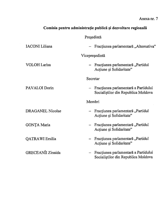 Comisia pentru administrație publică și dezvoltare regională este formată din șapte membri și va fi condusă de Liliana Iaconi. Aceasta va examina aspecte ce țin de organizarea și funcționarea autorităților administrației publice centrale și locale, serviciul public și organizarea administrativ-teritorială a țării.