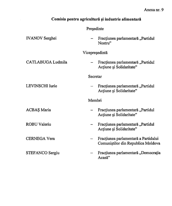 Comisia pentru agricultură și industrie alimentară va fi condusă de Serghei Ivanov și va fi constituită din șapte membri. Domeniile sale de activitate includ fondul funciar, dezvoltarea rurală, controlul calității alimentelor, precum și controlul veterinar și fitosanitar.