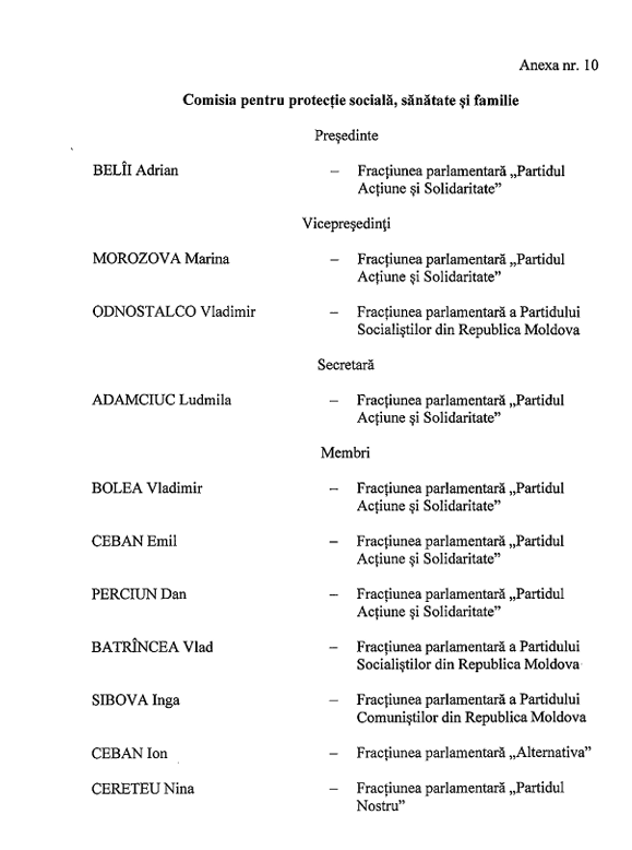 Comisia pentru protecție socială, sănătate și familie va fi condusă de Adrian Belîi și este formată din unsprezece membri. Activitatea acesteia vizează politicile de stat în domeniul asigurărilor sociale, asistenței sociale și sănătății publice.