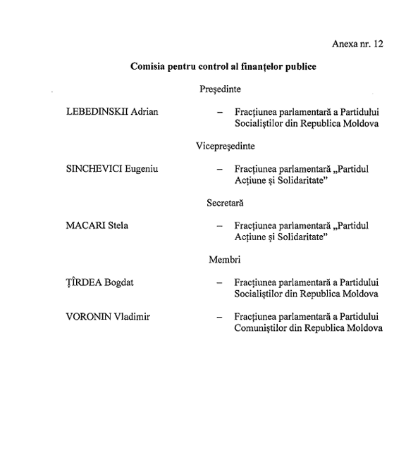 Comisia pentru control al finanțelor publice este formată din cinci membri și va fi condusă de Adrian Lebedinskii. Activitatea acesteia se concentrează pe asigurarea cadrului legal privind auditul public extern, supravegherea instituției supreme de audit și examinarea rapoartelor Curții de Conturi.