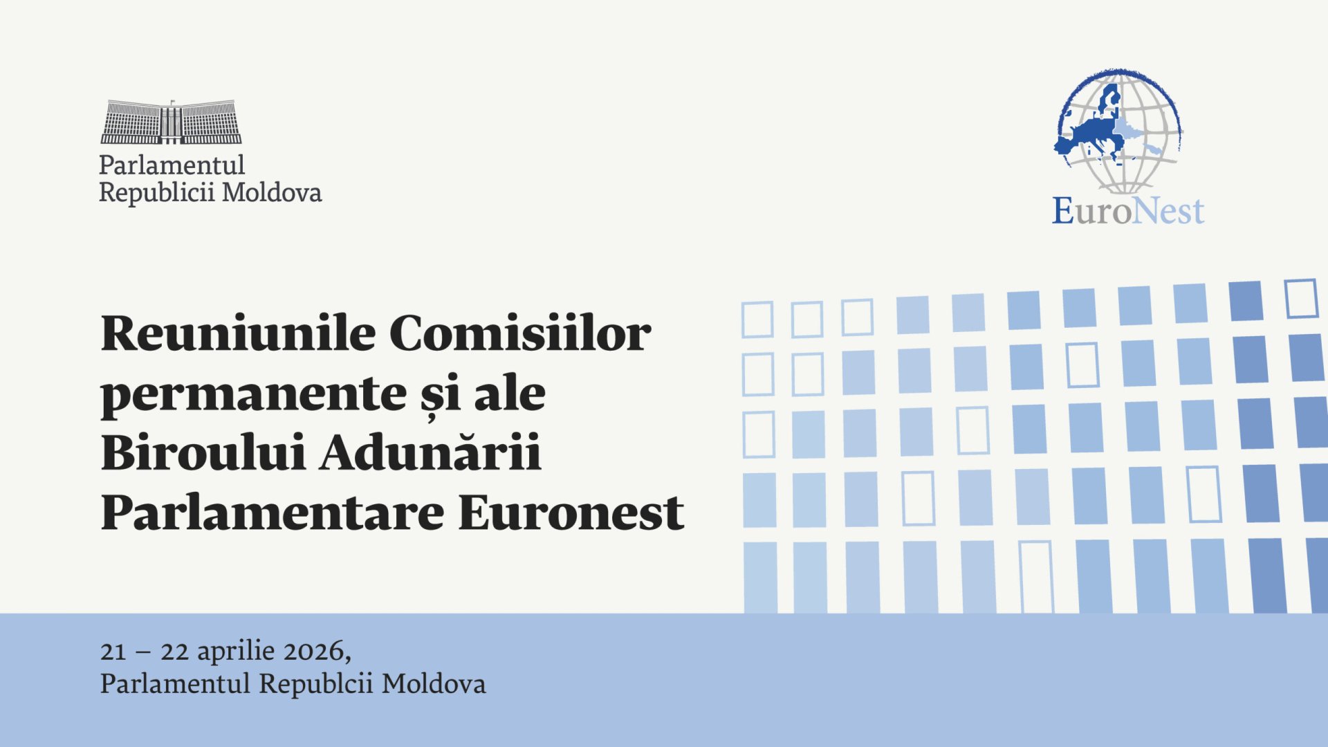 Reuniunile comisiilor permanente și ale Biroului Adunării Parlamentare Euronest se desfășoară la Parlamentul Republicii Moldova, în perioada 21–22 aprilie 2026, cu participarea delegațiilor parlamentare din statele Uniunii Europene și ale Parteneriatului Estic, transmite MOLDPRES.