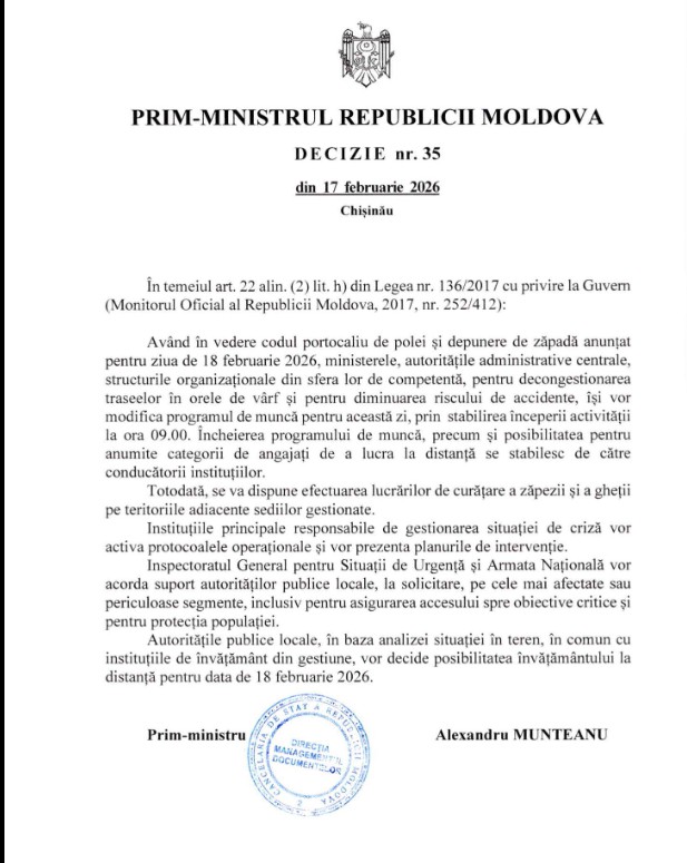 Potrivit deciziei premierului, ministerele, autoritățile centrale și alte instituții vor modifica programul de muncă pentru 18 februarie, începând activitatea la ora 09:00, pentru a reduce riscul de accidente și a decongestiona traficul. Încheierea programului și posibilitatea muncii la distanță vor fi stabilite de conducătorii instituțiilor, în funcție de necesitate.