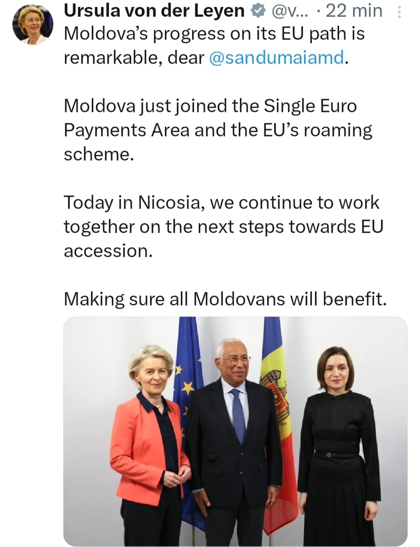 „Progresul Moldovei pe calea sa către UE este remarcabil. Moldova tocmai a aderat la Zona Unică de Plăți în Euro și la spațiul de roaming UE. Astăzi, la Nicosia, continuăm să lucrăm împreună asupra următorilor pași către aderarea la UE. Ne asigurăm că toți moldovenii vor beneficia", a afirmat Ursula von der Leyen.