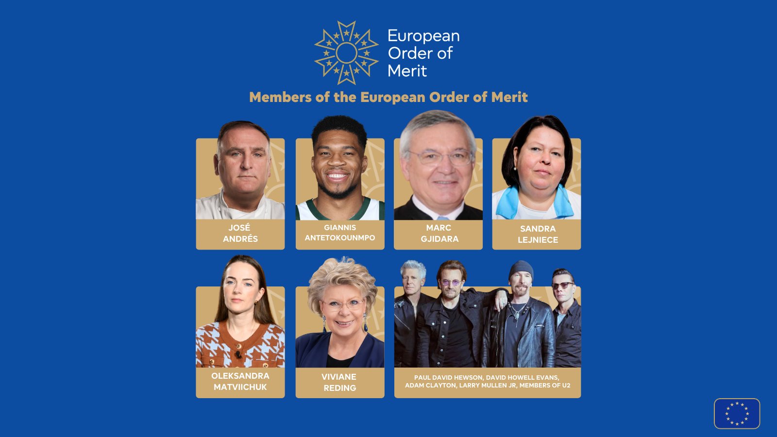 În același timp, José Andrés, chef și fondator al ONG-ului „World Central Kitchen”, Giannis Antetokounmpo, jucător de baschet, Marc Gjidara, avocat și savant, Sandra Lejniece, medic, om de știință și lider academic, Oleksandra Matviichuk, avocată în domeniul drepturilor omului, Viviane Reding, fostă vicepreședintă a Comisiei Europene, ex - membră a Camerei Deputaților din Luxemburg, fostă deputată în Parlamentul European, Paul David Hewson, cunoscut sub numele de Bono, David Howell Evans, Adam Charles Clayton și Laurence Joseph Mullen Jr, muzicieni și membri ai formației U2, au fost numiți membri ai Ordinului European de Merit.