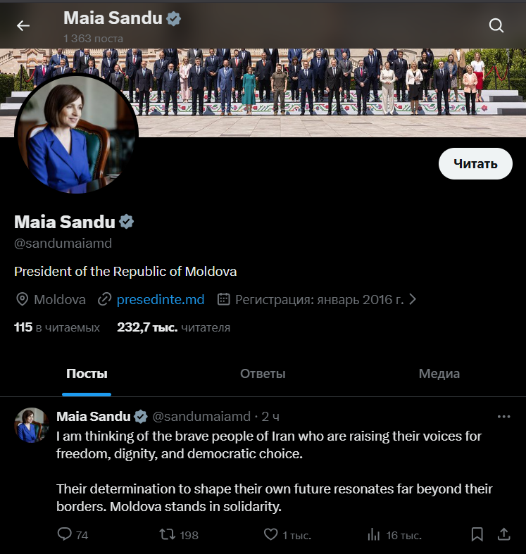 „Mă gândesc la oamenii curajoși din Iran care își ridică vocile pentru libertate, demnitate și alegeri democratice. Determinarea lor de a-și modela propriul viitor răsună mult dincolo de granițele lor. Moldova este solidară cu ei”, a declarat Maia Sandu pe platforma X.