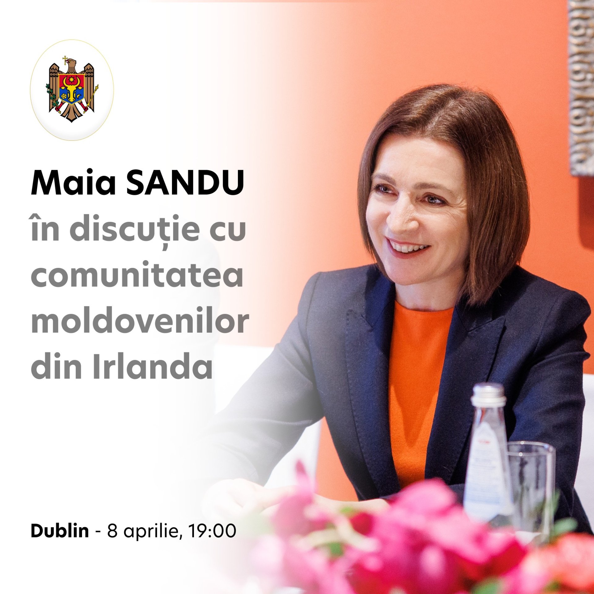 „Dragi moldoveni stabiliți în Irlanda, vă invit să ne întâlnim pe 8 aprilie, la Dublin, pentru a discuta despre Republica Moldova, evoluțiile recente din țară și rolul important al cetățenilor din diaspora în susținerea parcursului nostru european”, a anunțat președinta Maia Sandu.