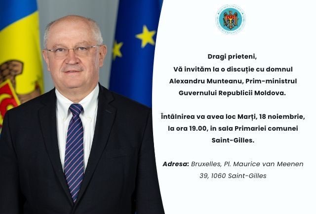„Dragi prieteni, vă așteptăm cu drag la o discuție cu Alexandru Munteanu, prim-ministru al Republicii Moldova. Întâlnirea va avea loc la data de 18 noiembrie 2025, ora 19.00 în sala Primăriei comunei Saint-Gilles. Adresa: Bruxelles, Pl. Maurice van Meenen 39, 1060 Saint-Gilles”, a comunicat Ambasada Republicii Moldova în Belgia și Luxemburg.