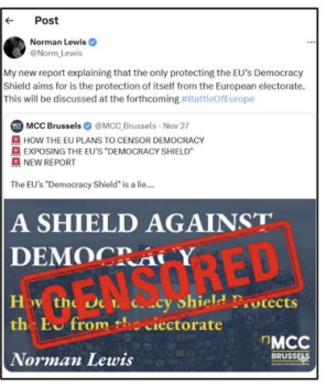 De asemenea, raportul evidențiază utilizarea deliberată a unor think-tank-uri și organizații civice occidentale aliniate ideologic Kremlinului pentru a introduce mesaje anti-europene în spațiul informațional moldovenesc. Un caz documentat este promovarea raportului „A Shield Against Democracy: How the Democracy Shield Protects the EU from the Electorate”, publicat de think-tank-ul MCC Brussels și semnat de academicianul Norman Lewis, cunoscut pentru pozițiile sale anti-UE. Documentul susține, în mod manipulator, că inițiativele europene de protejare a democrației ar reprezenta forme de cenzură și ingerință politică. Raportul a fost rapid preluat și amplificat de actori politici și instituții media din Republica Moldova aliniate agendei pro-ruse, fiind folosit ca „validare occidentală” pentru narațiuni anti-europene deja existente.