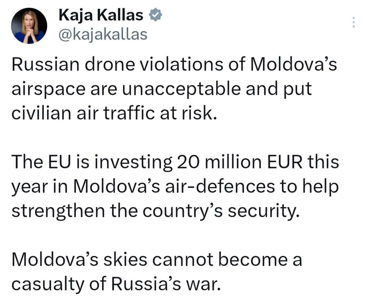 „Uniunea Europeană investește 20 de milioane de euro în acest an în apărarea antiaeriană a Republicii Moldova, pentru a sprijini consolidarea securității țării. Cerul Republicii Moldova nu poate deveni o victimă a războiului Rusiei”, a scris Kallas într-o postare pe rețeaua X.