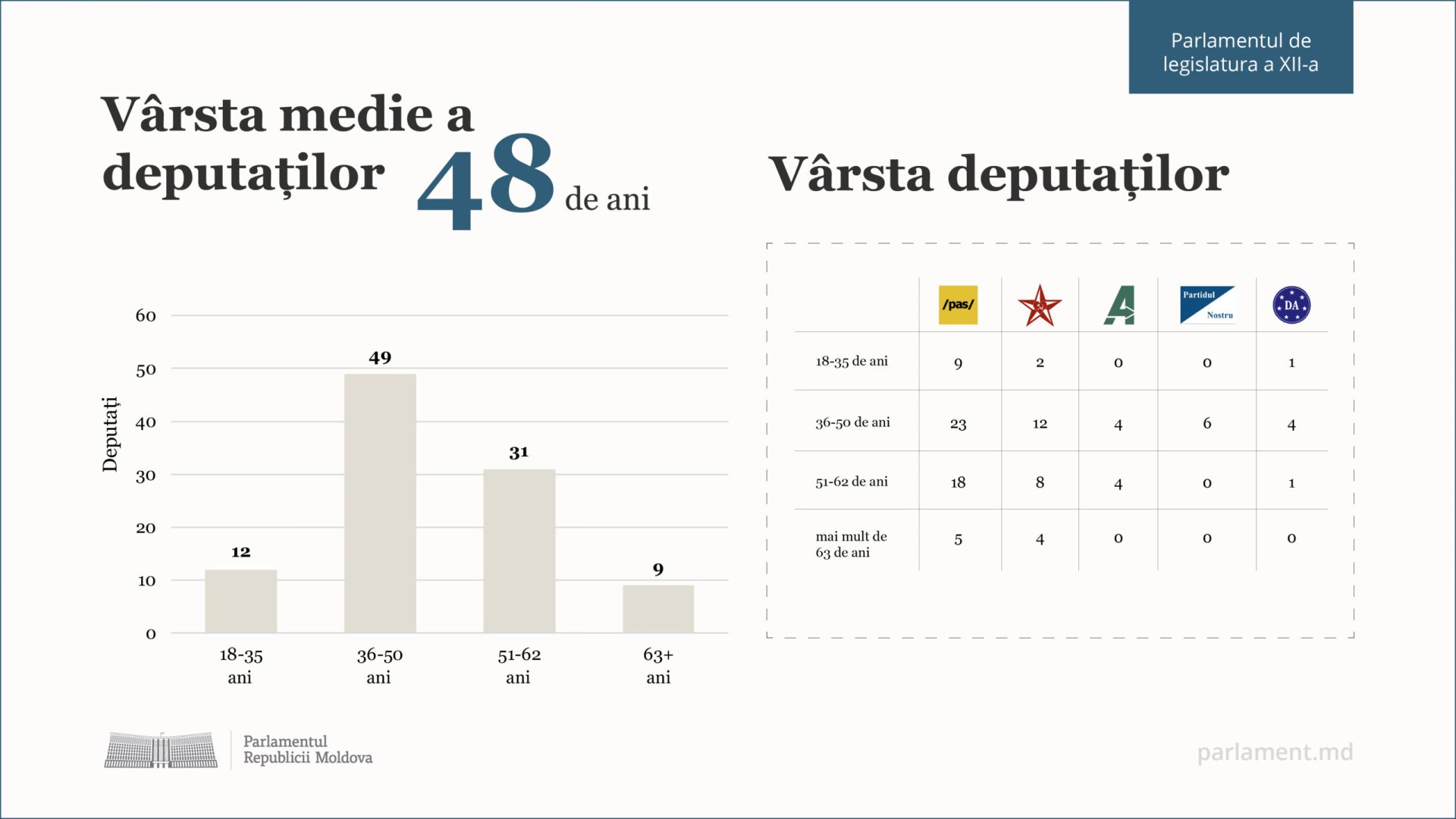 Cei mai tineri deputați din Parlamentul de legislatura a XII-a au 26 de ani. Este vorba de Anastasia Nichita și Eugeniu Sinchevici, aleși pe lista Partidului Acțiune și Solidaritate. În fracțiunea parlamentară „Partidul Acțiune și Solidaritate” se regăsesc cei mai mulți deputați tineri – nouă la număr. Alte două deputate de până la 35 de ani, Diana Caraman și Olga Cebotari, au fost alese pe lista Blocului Electoral „Patriotic al Socialiștilor, Comuniştilor, Inima și Viitorul Moldovei”. Pe lista Partidului Democrația Acasă a fost ales un deputat tânăr – Alexandru Chițu.