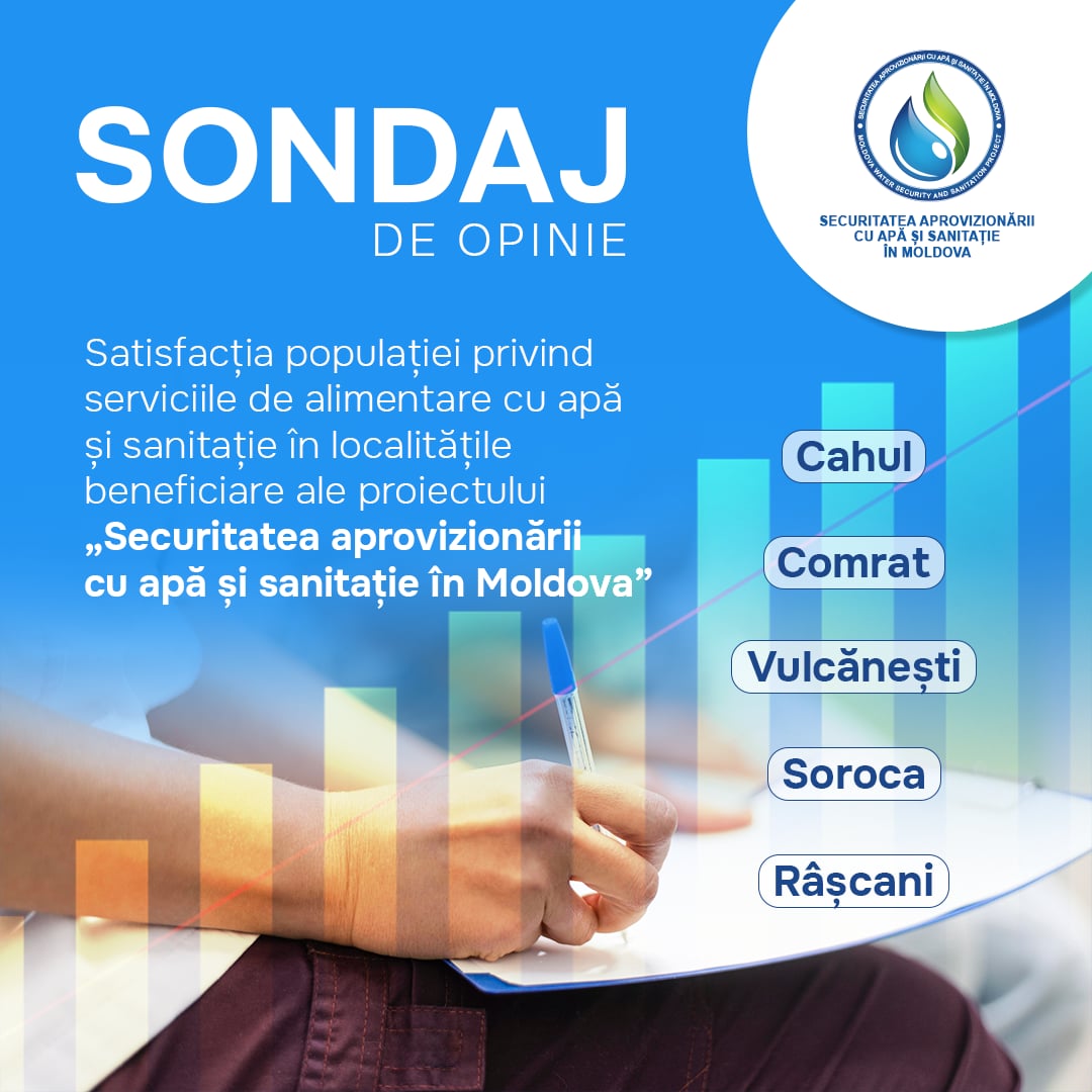 Studiul, realizat în perioda aprilie-iunie 2024, a implicat peste două mii de respondenți din municipiile Soroca și Comrat, orașul Vulcănești și satele din raioanele Râșcani și Cahul. Scopul principal al cercetării a constat în evaluarea nivelului de satisfacție al populației cu privire la serviciile de alimentare cu apă și canalizare.