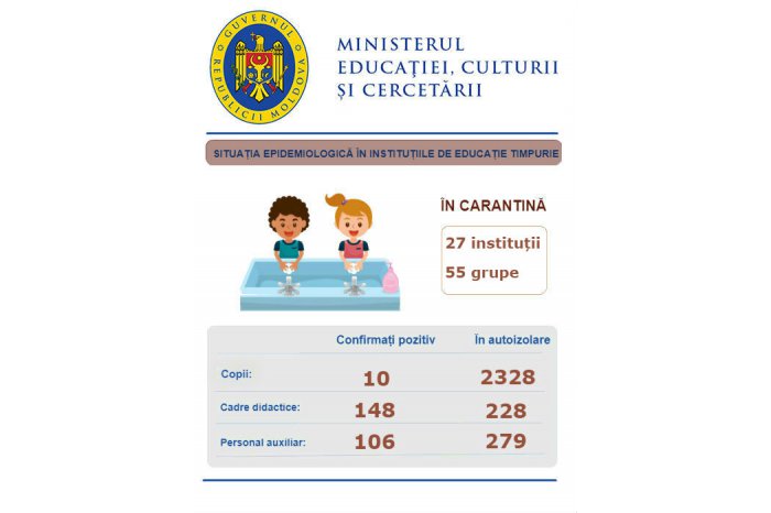„Din numărul total de 1398 de instituții de educație timpurie, și-au reluat activitatea la decizia fondatorului 1328 de instituții de învățământ. În prezent, 27 de instituții și 55 de grupe de copii se află în carantină. Copii confirmați pozitiv cu virusul COVID-19 sunt 10, iar alți 2328 se află în autoizolare. 148 de cadre didactice au fost confirmate pozitiv cu noul coronavirus, în autoizolare se află 228. Din personalul nedidactic și auxiliar au fost infectate cu noul virus 106 de persoane, iar alte 279 se află în autoizolare”, indică MECC.