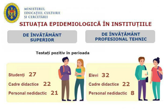 Potrivit Ministerului Educației, Culturii și Cercetării (MECC), 673 de cadre didactice au fost confirmate pozitiv cu noul coronavirus și 417 se află în izolare. Din personalul nedidactic și auxiliar au fost infectate cu noul virus 149 de persoane, iar alte 179 se află în autoizolare.