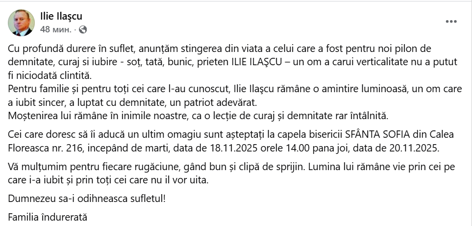 „Pentru noi, Ilie Ilașcu a fost și rămâne un pilon de demnitate, curaj și iubire. Exemplul său ne va însoți mereu”, a transmis familia.