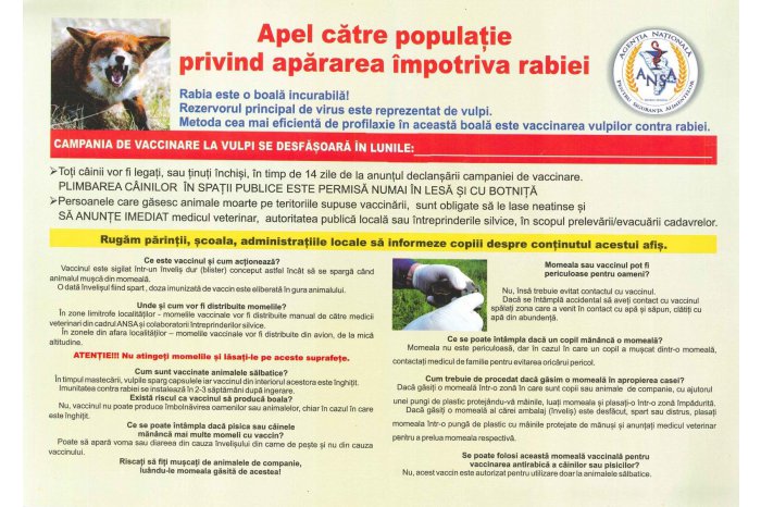 ANSA atenționează populația că vaccinul nu este destinat imunizării animalelor domestice dar, în cazul consumului accidental, s-a constatat că vaccinul nu este dăunător pentru acestea.