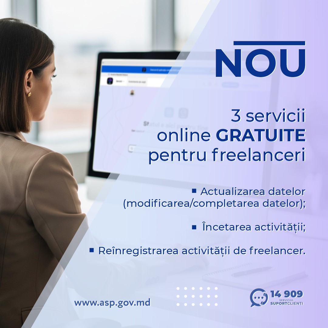 Agenția Servicii Publice (ASP) a anunțat lansarea a trei servicii digitale noi, destinate antreprenorilor individuali (freelancerilor) înregistrați în Republica Moldova. Serviciile sunt gratuite și pot fi accesate integral online, fără deplasare la ghișeu, iar singura condiție obligatorie pentru utilizarea acestora este deținerea unei semnături electronice valide, transmite MOLDPRES.