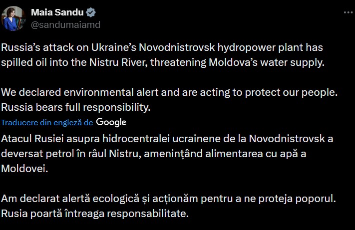 „Atacul Rusiei asupra hidrocentralei ucrainene de la Novodnistrovsk a deversat petrol în râul Nistru, amenințând alimentarea cu apă a Moldovei. Am declarat alertă ecologică și acționăm pentru a ne proteja poporul. Rusia poartă întreaga responsabilitate”, a scris Maia Sandu pe platforma X.