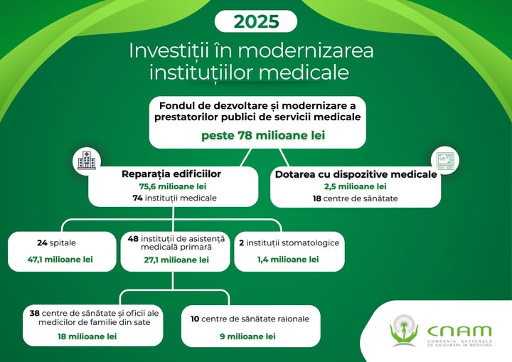 Potrivit Companiei Naționale de Asigurări în Medicină (CNAM), în 2025 au fost finalizate aproape 100 de proiecte investiționale, selectate prin concurs. Dintre acestea, aproximativ 80 vizează renovarea clădirilor, iar 18 proiecte sunt destinate dotării cu echipamente medicale moderne.