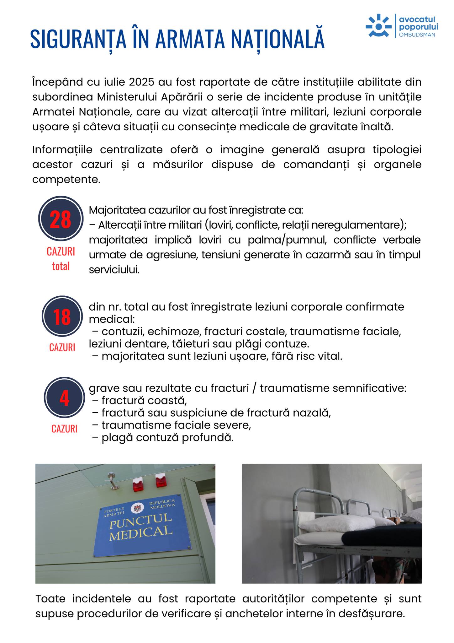 Potrivit informațiilor transmise de Marele Stat Major al Armatei Naționale ombudsmanului, în perioada 1 iulie – 1 decembrie 2025 au fost înregistrate 28 de cazuri de altercații între militarii în termen. Dintre acestea, 18 incidente s-au soldat cu leziuni corporale, iar patru au fost calificate drept grave, incluzând plăgi, fracturi și traumatisme.