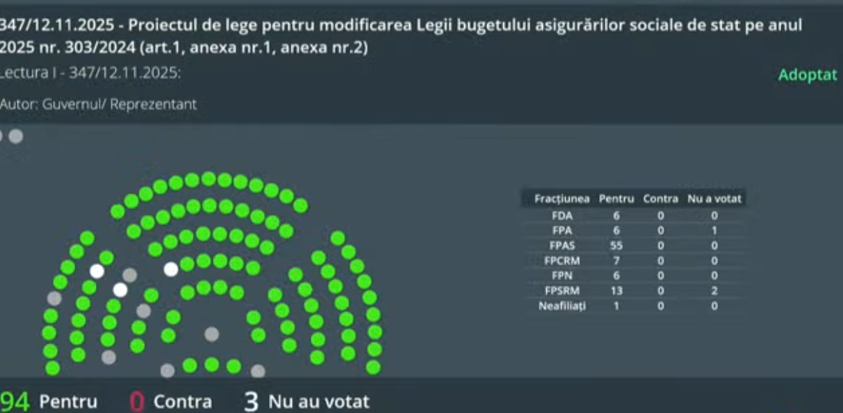 Bugetul asigurărilor sociale de stat se va majora cu 903 milioane de lei, până la 49,39 miliarde de lei, după ce Parlamentul a aprobat în prima lectură rectificările la Legea Bugetului Asigurărilor Sociale de Stat pentru anul 2025. Proiectul de lege a fost votat de 94 de deputați, transmite MOLDPRES.