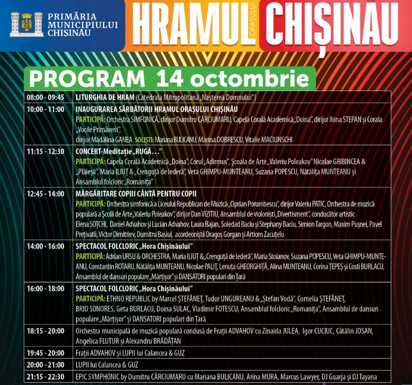 Program special de hramul capitaleiDe hramul capitalei, în centrul orașului vor avea loc târguri ale producătorilor autohtoni și ale meșterilor populari, precum și activități comerciale cu bucate tradiționale.