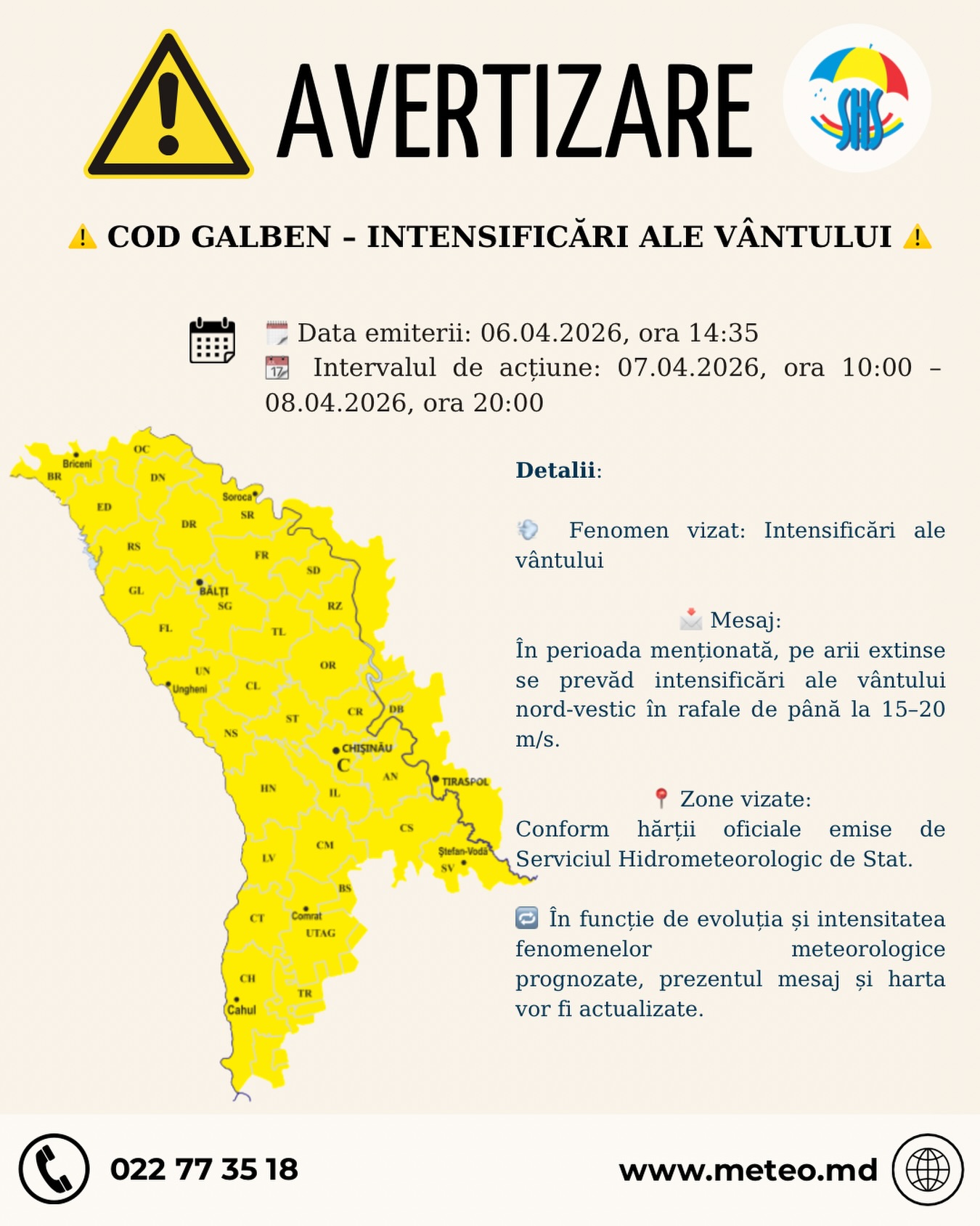 Intensificări ale vântului sunt prognozate pe întreg teritoriul Republicii Moldova în perioada 7 aprilie, ora 10:00 – 8 aprilie, ora 20:00, potrivit unei avertizări de cod galben emise la 6 aprilie, de Serviciul Hidrometeorologic de Stat, transmite MOLDPRES.
