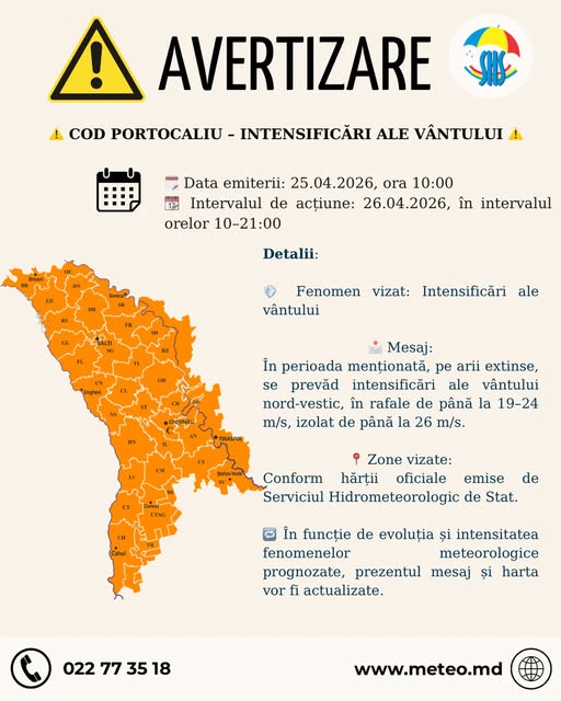 Serviciul Hidrometeorologic de Stat a emis o avertizare de cod portocaliu de vânt puternic pentru data de 26 aprilie 2026. Potrivit prognozelor, în intervalul orelor 10:00 – 21:00, pe arii extinse se vor înregistra intensificări ale vântului nord-vestic, cu rafale de până la 19–24 m/s, iar izolat chiar până la 26 m/s, transmite MOLDPRES.