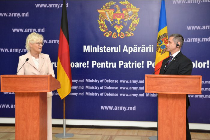 Chişinău, 1 oct. /MOLDPRES/. Ministrul Apărării Anatolie Nosatîi și ministrul Apărării al Republicii Federale Germania, Christine Lambrecht, au susținut astăzi, la Chișinău, declarații de presă cu privire la cooperarea moldo-germană în sectorul de apărare, comunică MOLDPRES.