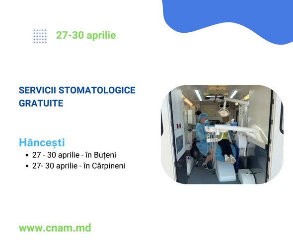 Potrivit Companiei Naționale de Asigurări în Medicină (CNAM), în perioada 27 – 30 aprilie, medicii specialiști se vor afla în localitățile din Hâncești. Astfel, în zilele 27 – 30 aprilie medicii vor munci la în Buțeni, iar pe 27 – 30 aprilie – în Cărpineni.