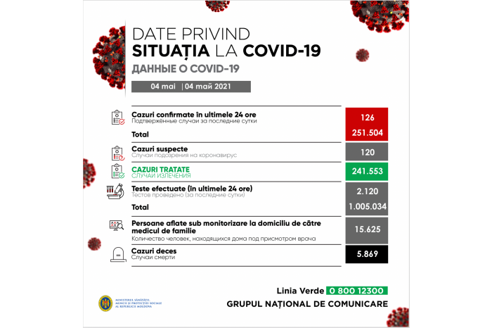 Chişinău, 4 mai. /MOLDPRES/. În ultimele 24 de ore, în Republica Moldova au fost procesate 2.120 de teste, fiind confirmate 126 de cazuri de infecție cu noul coronavirus. În total, până la ziua de astăzi, în ţară au fost înregistrate 251.504 cazuri de COVID-19, transmite MOLDPRES.