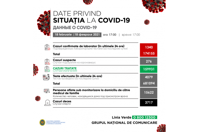 Chişinău, 18 feb. /MOLDPRES/. În ultimele 24 de ore, în Republica Moldova au fost procesate 4079 de teste, fiind confirmate 1340 de cazuri de infecție cu noul coronavirus. În total, până la ziua de astăzi, în ţară au fost înregistrate 174 155 de cazuri de COVID-19, transmite MOLDPRES.
