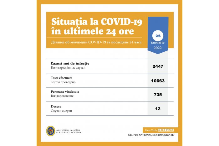 Chişinău, 22 ian. /MOLDPRES/. În ultimele 24 de ore, în Republica Moldova au fost efectuate 10663 de teste, fiind confirmate 2447 de cazuri de infecție cu noul coronavirus. Din numărul de cazuri noi, 22 sunt asociate cu contact în afara țării. Astfel, până la ziua de astăzi, în țară s-au înregistrat 407.003 cazuri de COVID-19, relatează MOLDPRES.