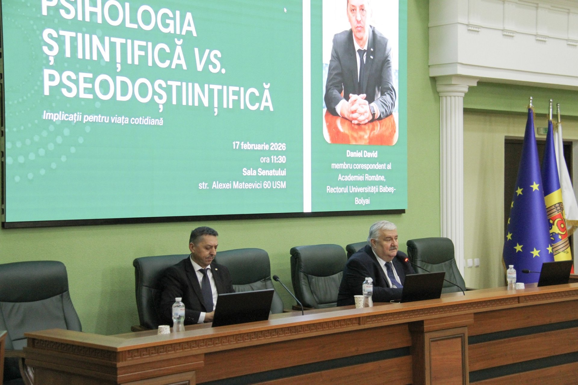 Rectorul Universității „Babeș-Bolyai” (UBB) din Cluj-Napoca, prof. univ. dr. Daniel David, membru corespondent al Academiei Române și fost ministru al Educației din România, a susținut marți, 17 februarie, la Universitatea de Stat din Moldova (USM), lecția publică cu tema „Psihologia științifică vs. pseudoștiințifică: Implicații pentru viața cotidiană”, transmite MOLDPRES.