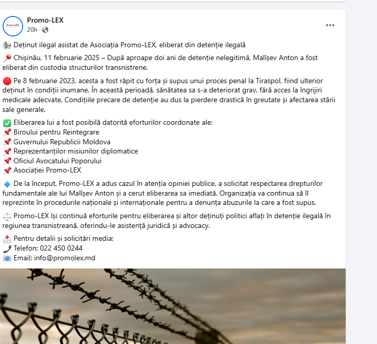 Promo-LEX a subliniat că își continuă eforturile pentru eliberarea și altor deținuți politici aflați în detenție ilegală în regiunea transnistreană, oferindu-le asistență juridică și advocacy.
