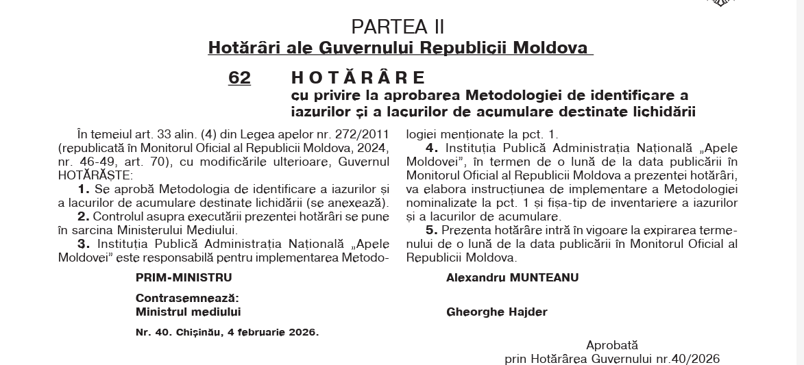 Autoritățile vor aplica noi criterii și proceduri în analiza barajelor și lacurilor de acumulare pentru stabilirea riscurilor pe care acestea le pot reprezenta pentru populație și mediu. Normele sunt incluse în Metodologia de identificare și evaluare a iazurilor și lacurilor de acumulare publicată astăzi în Monitorul Oficial, transmite MOLDPRES.
