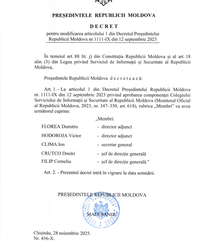 Componența Colegiului Serviciului de Informații și Securitate (SIS) a fost modificată. Un decret prezidențial în acest sens a fost semnat pe 28 noiembrie de președinta Maia Sandu, informează MOLDPRES.