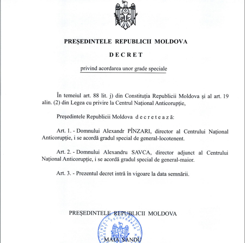 Directorul Centrului Național Anticorupție (CNA), Alexandr Pînzari, a primit gradul special de general-locotenent. Un decret în acest sens a fost semnat astăzi de șefa statului Maia Sandu, informează MOLDPRES.