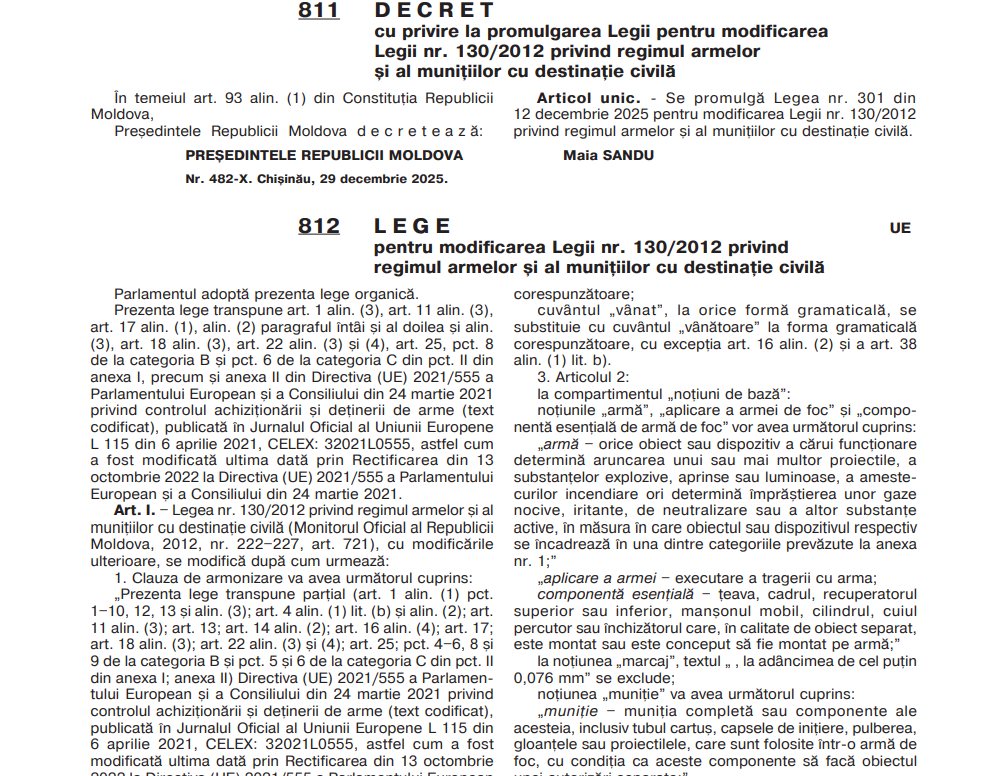 Președinta Republicii Moldova, Maia Sandu, a promulgat Legea nr. 301 din 12 decembrie 2025 pentru modificarea Legii nr. 130/2012 privind regimul armelor și al munițiilor cu destinație civilă. Decretul de promulgare a fost semnat la 29 decembrie 2025, în temeiul articolului 93 alineatul (1) din Constituția Republicii Moldova, transmite MOLDPRES.