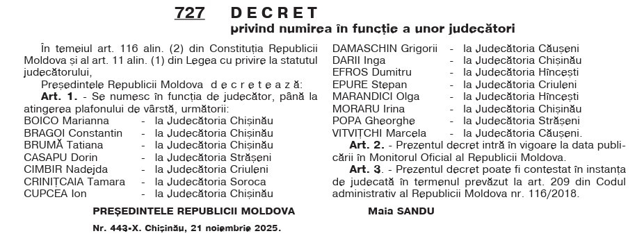 Decretul președintei Republicii Moldova, Maia Sandu, prin care numește mai mulți judecători în funcție până la atingerea plafonului de vârstă, a fost publicat în Monitorul Oficial și a intrat în vigoare, comunică MOLDPRES.
