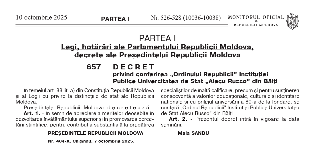DOC // Universitatea de Stat „Alecu Russo” din Bălți a fost distinsă cu „Ordinul Republicii”