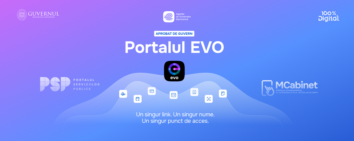 Portalul integrat EVO va fi lansat până la sfârșitul acestui an și va reuni într-un singur loc toate serviciile publice online destinate cetățenilor, antreprenorilor și diasporei. Agenția de Guvernare Electronică (AGE) va asigura dezvoltarea și completarea continuă a ecosistemului EVO, cu o investiție inițială de circa 1,5 milioane de lei, destinată dezvoltării infrastructurii și centralizării accesului la servicii electronice, informează MOLDPRES.