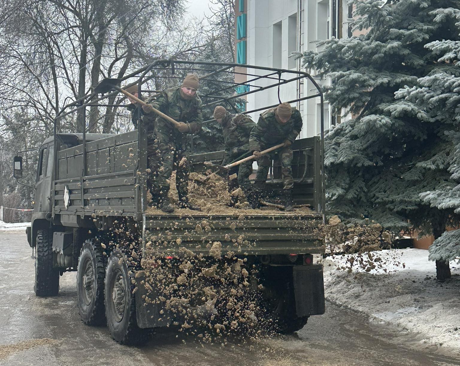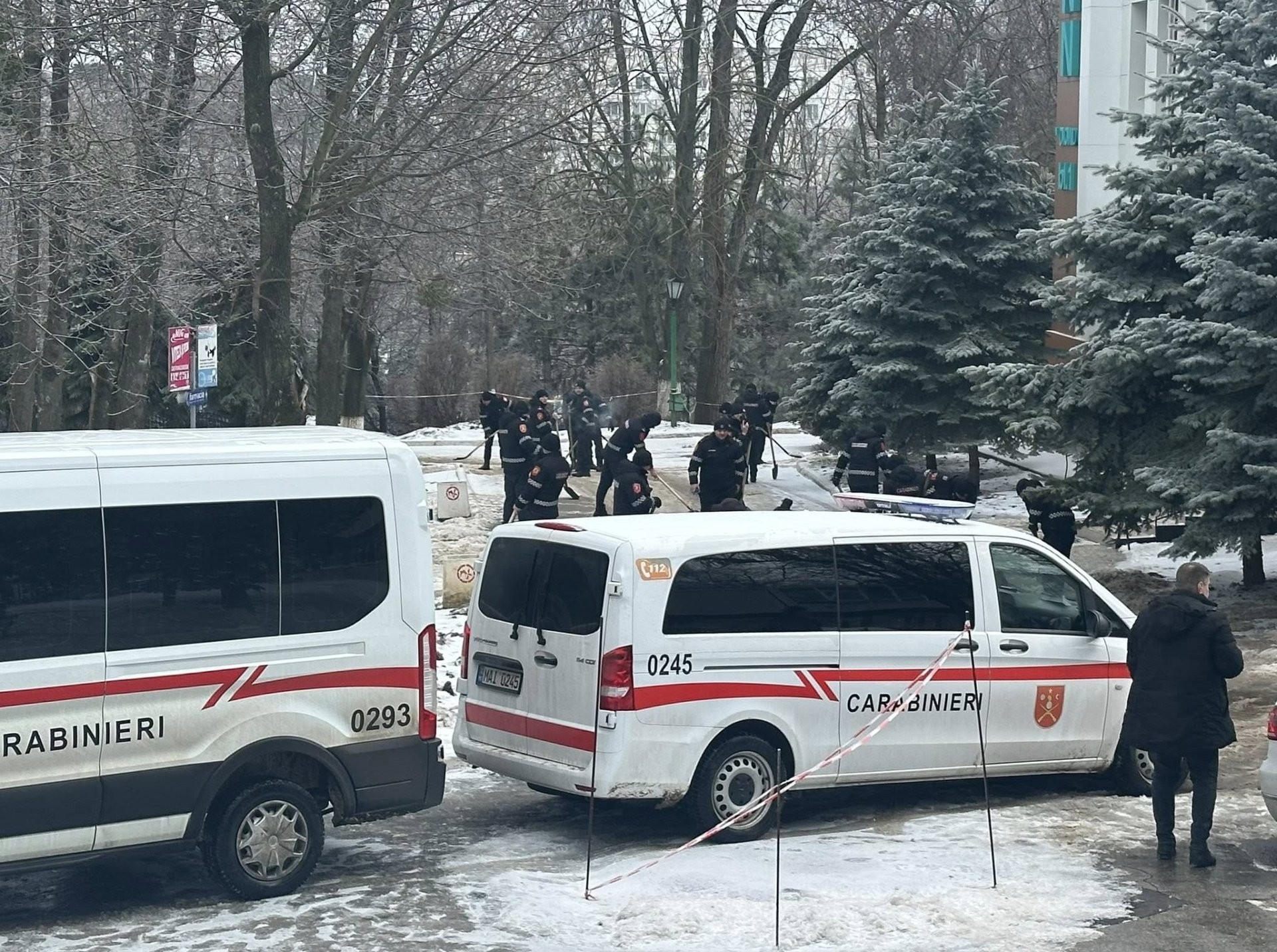 Mai mulți carabinieri au asigurat degivrarea trotuarelor și a căilor de acces spre instituția medicală. De asemenea, aceștia au împrăștiat nisip pentru a preveni lunecușul.