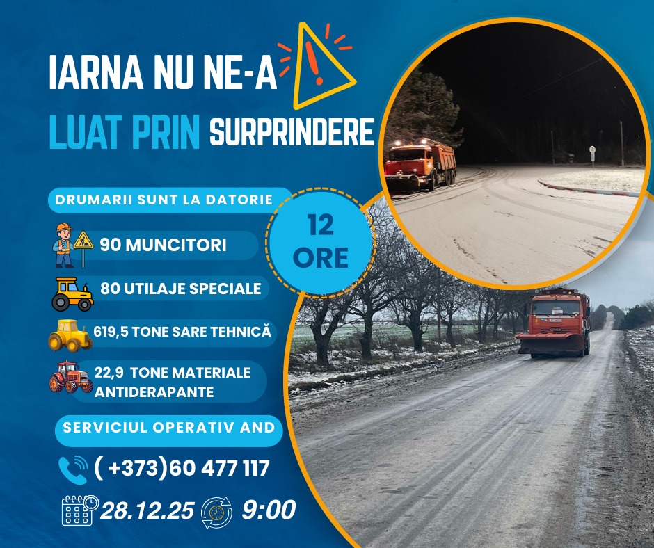 AND a îndemnat participanții la trafic să țină cont de atenționările autorităților, să nu pornească la drum fără pneuri de iarnă, să se informeze din timp despre starea vremii și să adapteze regimul de viteză la condițiile de circulație pe timp de iarnă.