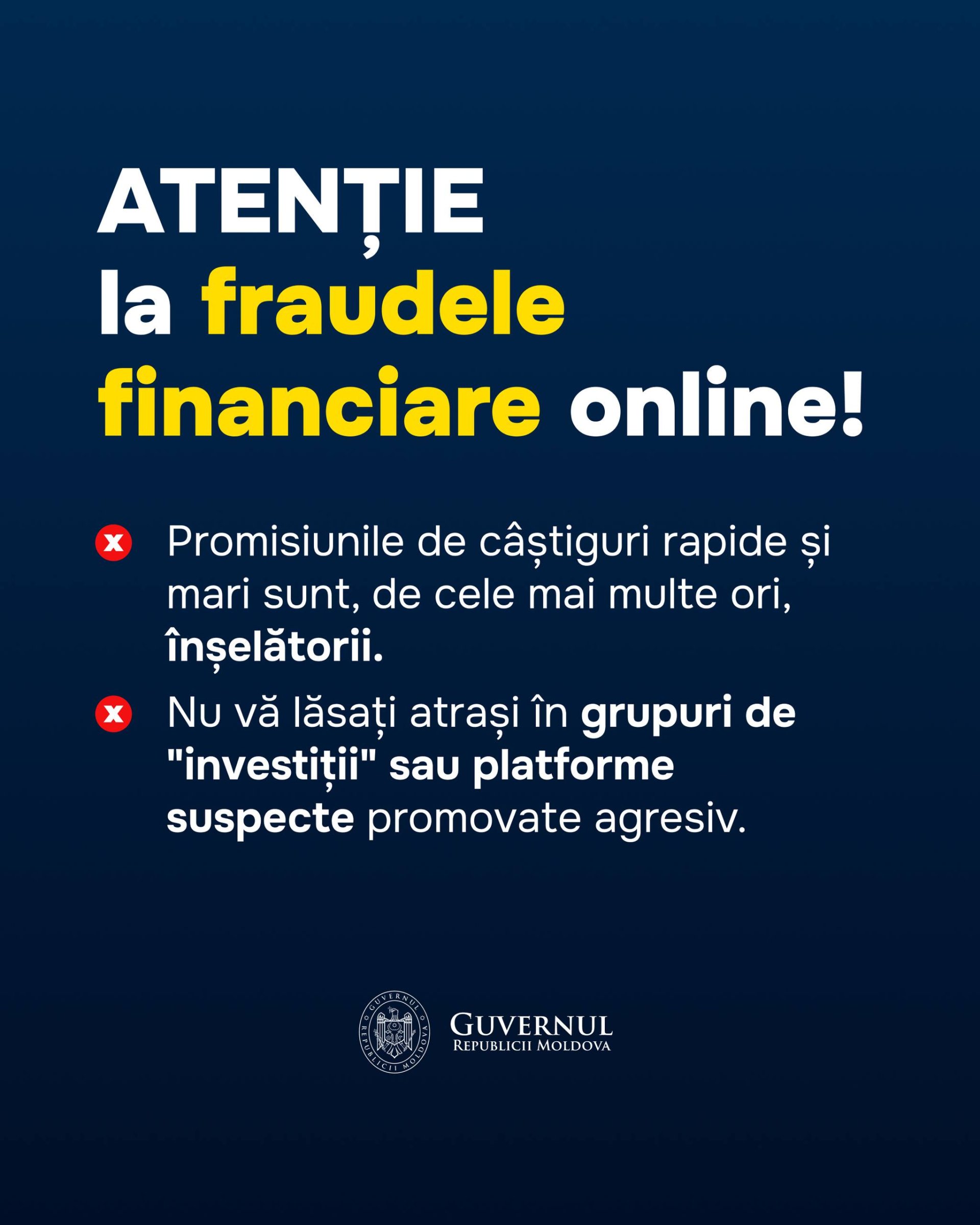 Guvernul a atenționat astăzi cetățenii privind fraudele financiare online și i-a îndemnat să fie precauți și să nu se lase atrași în grupuri de „investiții” sau platforme suspecte, transmite MOLDPRES.
