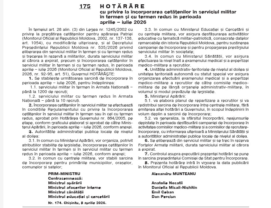 Hotărârea Guvernului privind încorporarea cetățenilor în serviciul militar în termen și cu termen redus, pentru perioada aprilie–iulie 2026, a fost publicată în Monitorul Oficial al Republicii Moldova și a intrat în vigoare, comunică MOLDPRES.
