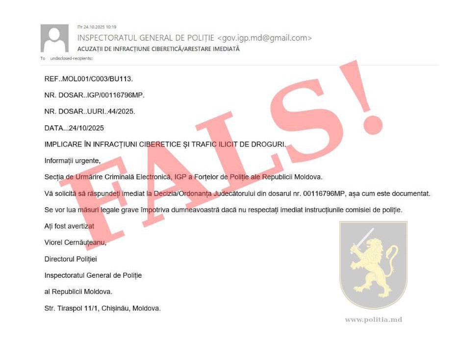 Inspectoratul General al Poliției (IGP) anunță că, în ultimele zile, pe adresele electronice ale cetățenilor sunt expediate mesaje cu conținut fals, parvenite din numele Poliției, informează MOLDPRES.