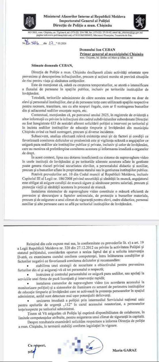 „În acest context, poliția a recomandat administrației publice locale elaborarea unei strategii de securitate pentru instituțiile de învățământ, prin instalarea sistemelor de supraveghere video, cu posibilitatea acordării accesului la monitorizare pentru poliție, în condițiile legii. Mizăm pe o colaborare eficientă cu Primăria Chișinău, pentru a spori siguranța copiilor și a persoanelor care locuiesc în capitală”, a precizat IGP.