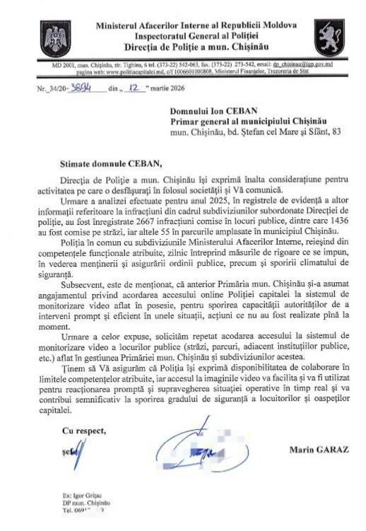 „Analiza efectuată arată că majoritatea infracțiunilor sunt comise în locuri publice. În acest sens, IGP a transmis două demersuri către Primăria municipiului Chișinău, prin care a solicitat acces online la sistemul de monitorizare video a spațiilor publice, aflate în gestiunea autorității publice locale și a subdiviziunilor acesteia. Scopul este de a spori capacitatea autorităților de a interveni prompt și eficient în diverse situații”, a comunicat instituția.