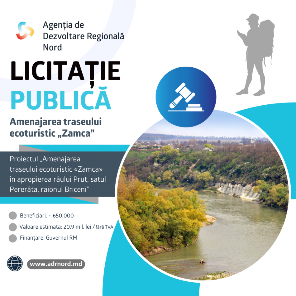 Agenția de Dezvoltare Regională (ADR) Nord a anunțat lansarea procedurii de licitație publică pentru executarea lucrărilor de construcții în cadrul proiectului „Amenajarea traseului ecoturistic „Zamca” în apropierea râului Prut, satul Pererâta, raionul Briceni”, transmite MOLDPRES.