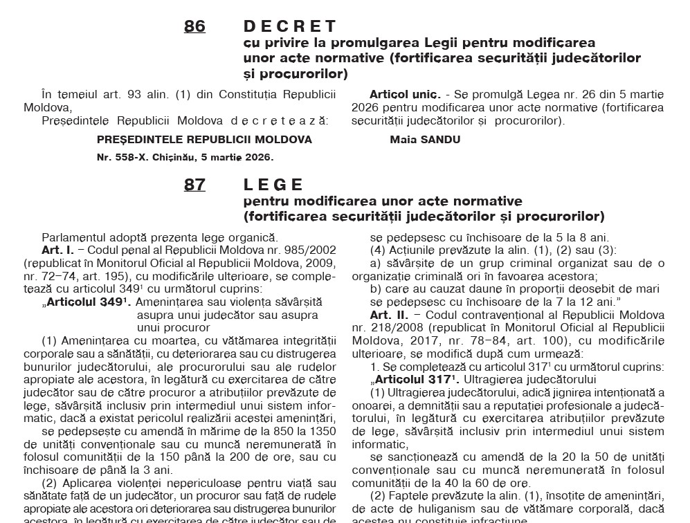 Decretul de promulgare semnat de președintele Maia Sandu și Legea nr. 26 din 5 martie 2026 pentru modificarea unor acte normative (fortificarea securității judecătorilor și procurorilor) au fost publicate în Monitorul Oficial și au intrat în vigoare, comunică MOLDPRES.
